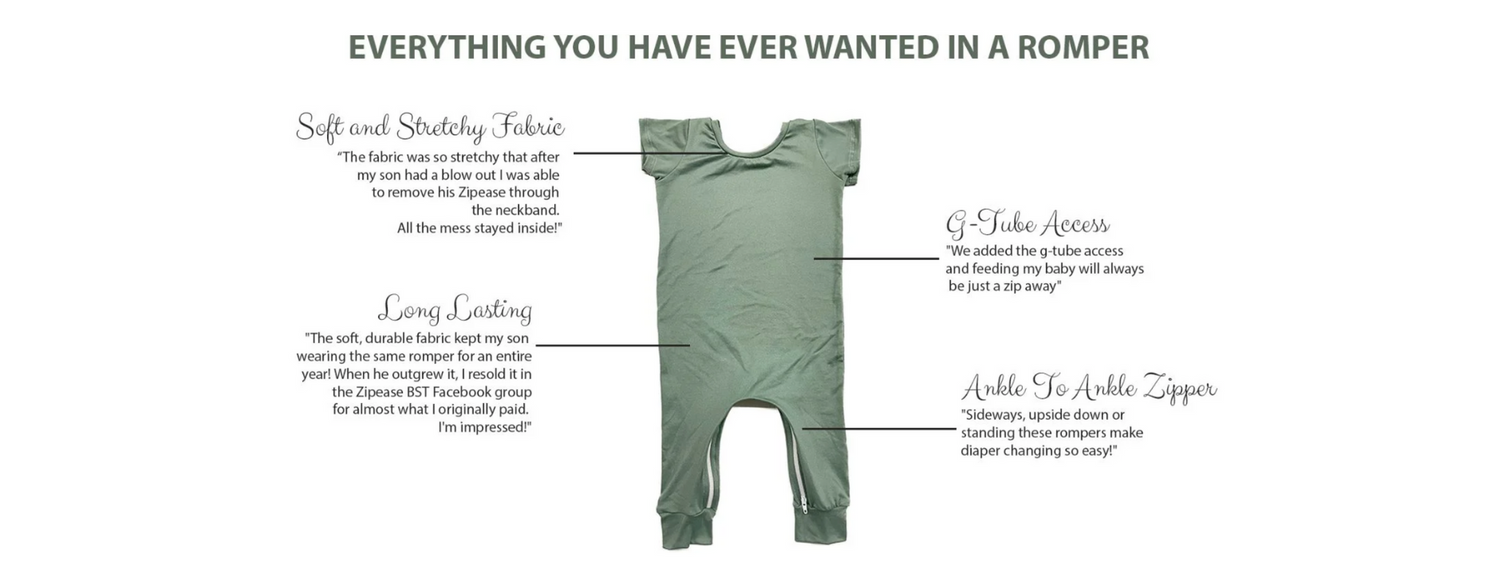 from 592 reviewsI met Taeler at the Abilities Expo in Phoenix, and I am so glad I did! I had been looking for a way to be able to feed my Gtube fed son while he slept, and this was the solution! The romper is very well made, comfortable, and keeps my kiddo cool in the hot temps here in Phoenix. It also makes diaper changes a breeze, and can easily be taken off in either direction. Highly recommend!
