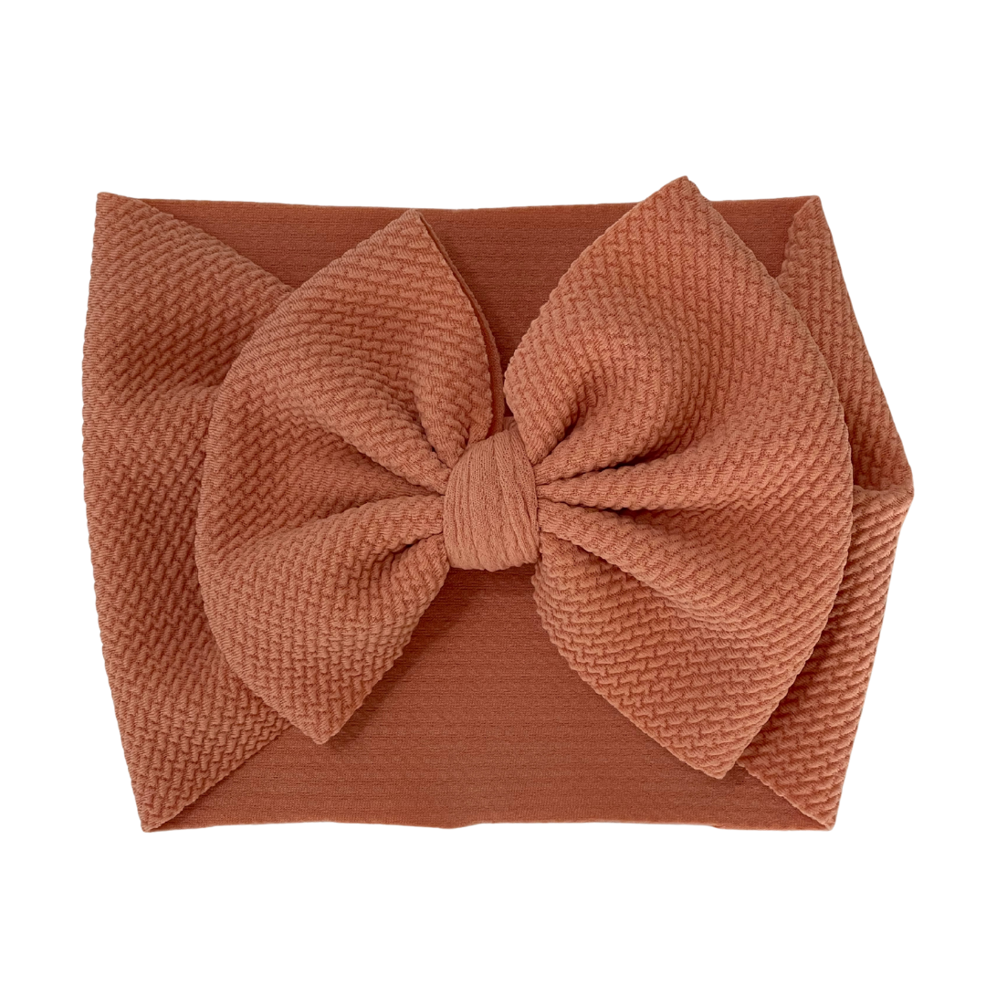 My high-quality headband bows are the perfect accessory for your little girl. Made with stretchy, textured material, you'll have fun styling outfits with any color! Best of all, they will never come unraveled so washing is simple! Available in baby and toddler (please see size chart for reference).