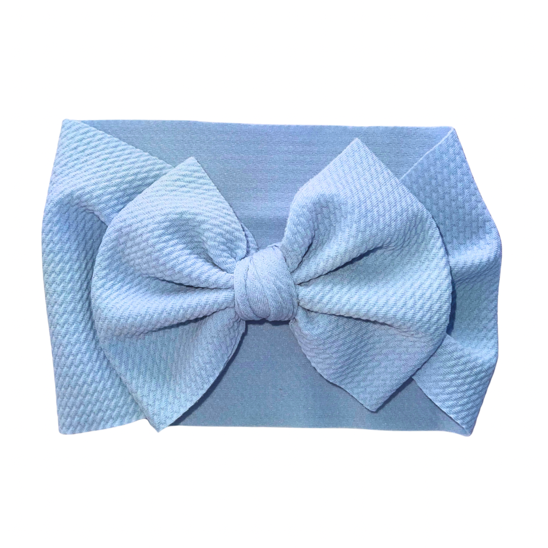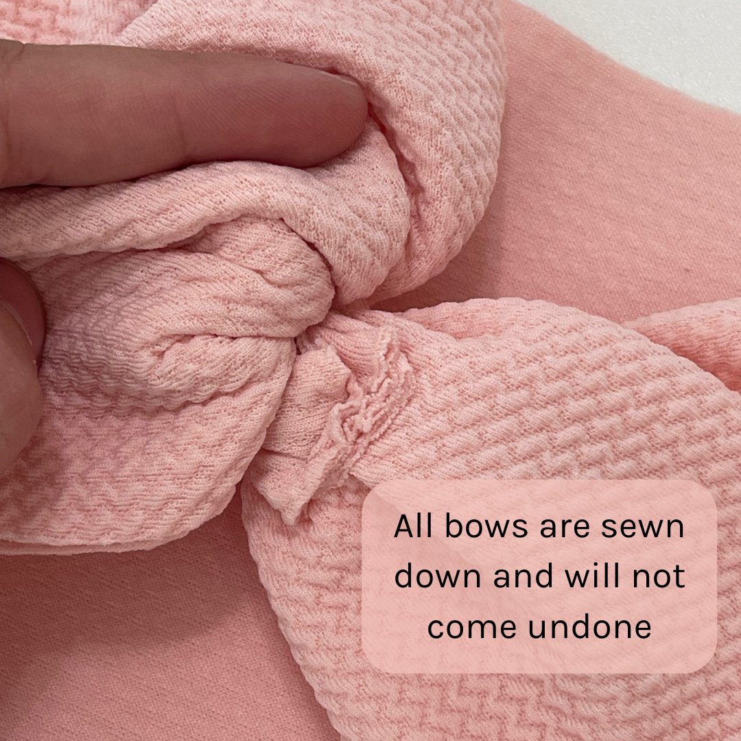 My high-quality headband bows are the perfect accessory for your little girl. Made with stretchy, textured material, you'll have fun styling outfits with any color! Best of all, they will never come unraveled so washing is simple! Available in baby and toddler (please see size chart for reference).